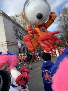 Let’s talk about the balloons, because those are the most terrifying things about the parade. You do not have to be trained to hold the balloon, even though it takes a professional amount of strength and coordination. The only two balloons I saw manuevered were Snoopy and Jett, which was enough to increase my stress levels right before showtime. Snoopy himself is an unruly beast. Because of his odd shape, he catches the wind in the worst way and is notoriously the worst balloon to handle. Again, you don’t need experience to hold a balloon, but when the leader was shouting, “Left flank! MATRIX ONE, MATRIX ONE!” you have to think they put the veteran balloon holders on this dipshit dog.
